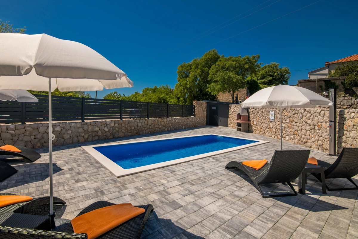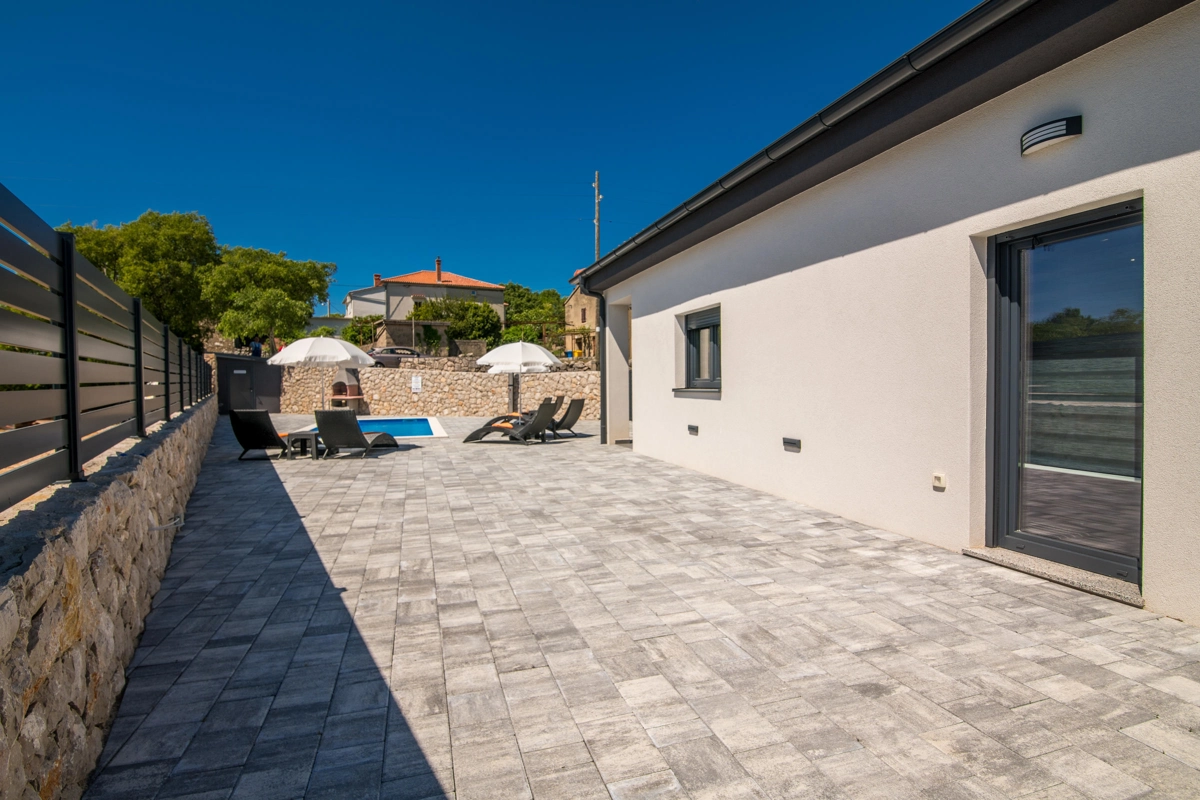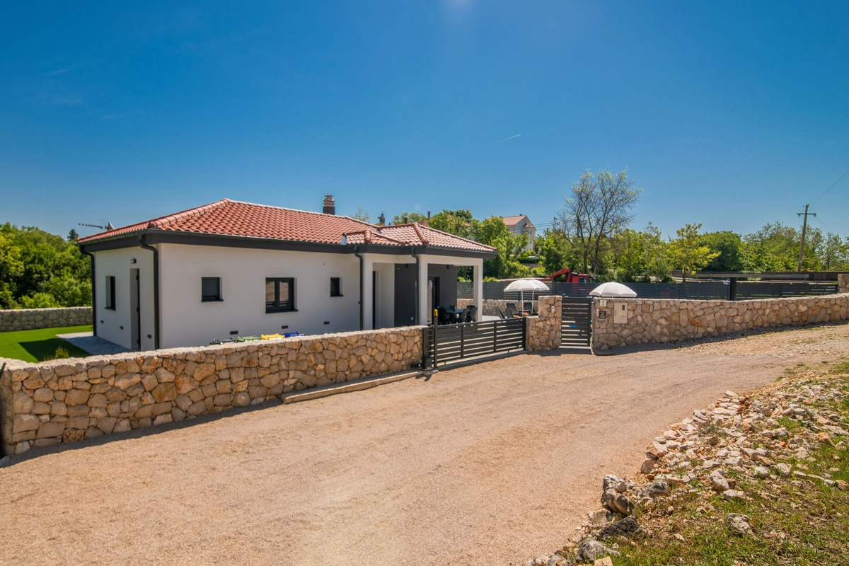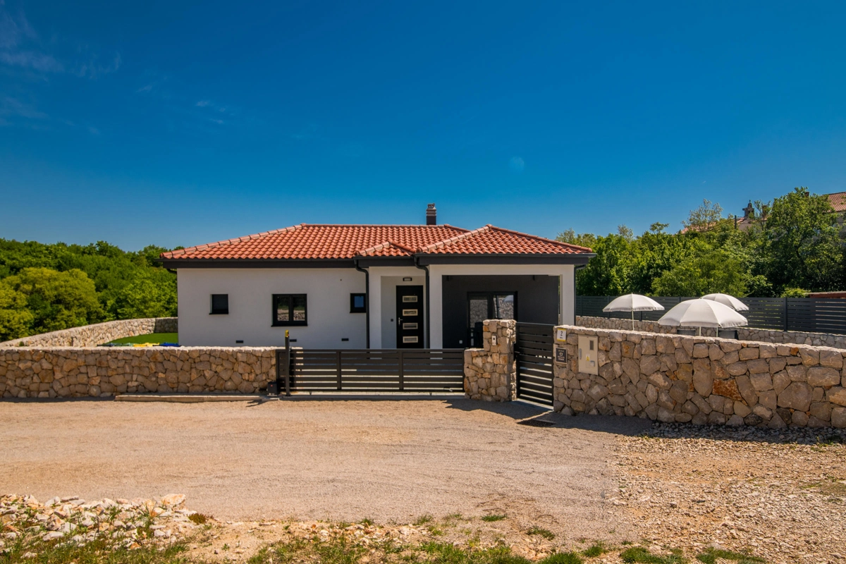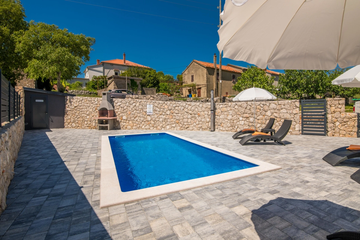 Villa Enie, eine neu erbaute, moderne Villa in Garica bei Vrbnik, verfügt über einen eigenen Pool und bietet Platz für bis zu sechs Personen. Es liegt nur wenige Autominuten von der wunderschönen Stadt Krk entfernt, wo Sie die Altstadt und die wunderschönen Strände besuchen können, sowie von Vrbnik, das für seine lokalen Weine und lokalen Souvenirläden bekannt ist. Die Villa Enie liegt vollständig im Erdgeschoss und bietet einen herrlichen Blick ins Grüne und auf den Wald, den Sie am meisten genießen werden, während Sie in dieser ruhigen Umgebung Ihren Morgenkaffee trinken. Das Haus besteht aus einer geräumigen Küche mit Esszimmer und Wohnzimmer, zwei Doppelzimmern, einem Einzelzimmer und zwei kompletten Badezimmern mit Dusche. Es gibt auch eine überdachte Terrasse mit Blick auf den Pool. Im Innenhof der Villa Enie gibt es einen privaten Swimmingpool und einen Bereich mit Liegestühlen sowie eine Außendusche und einen Grill. Villa Enie ist klimatisiert und verfügt über WLAN und einen privaten Parkplatz für mehrere Autos.