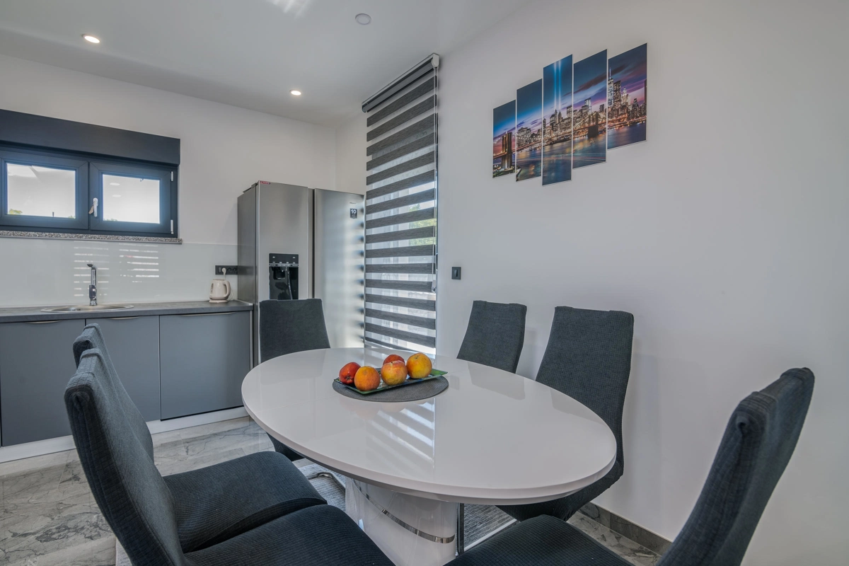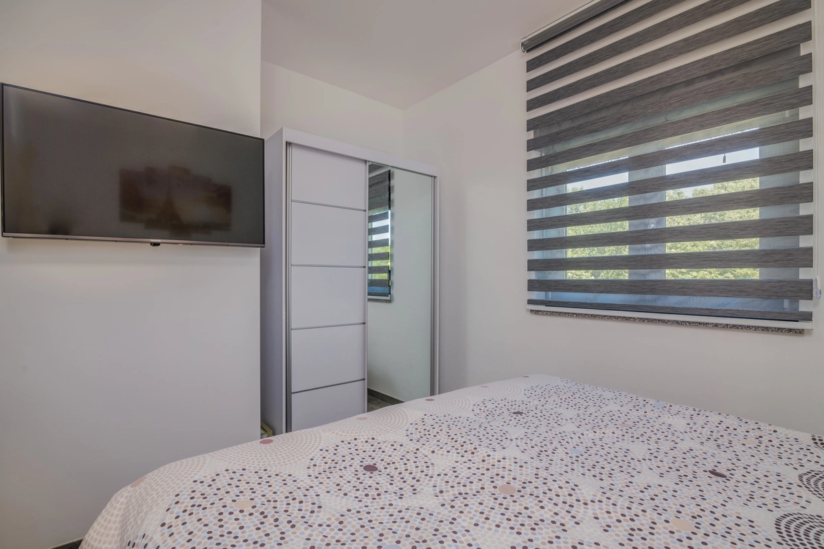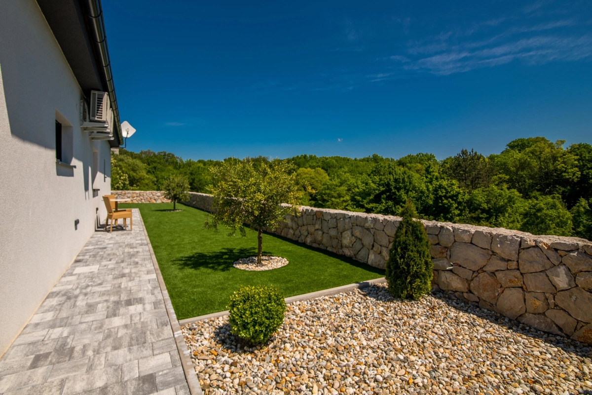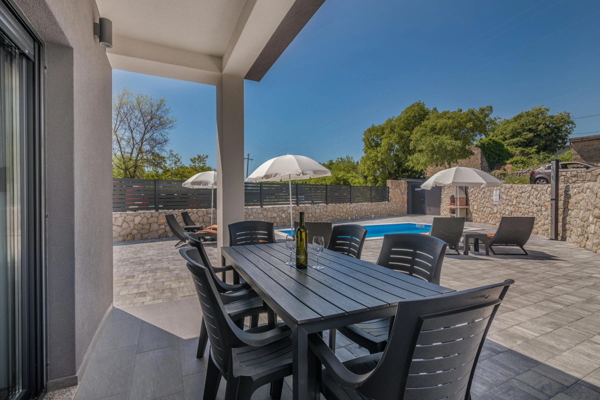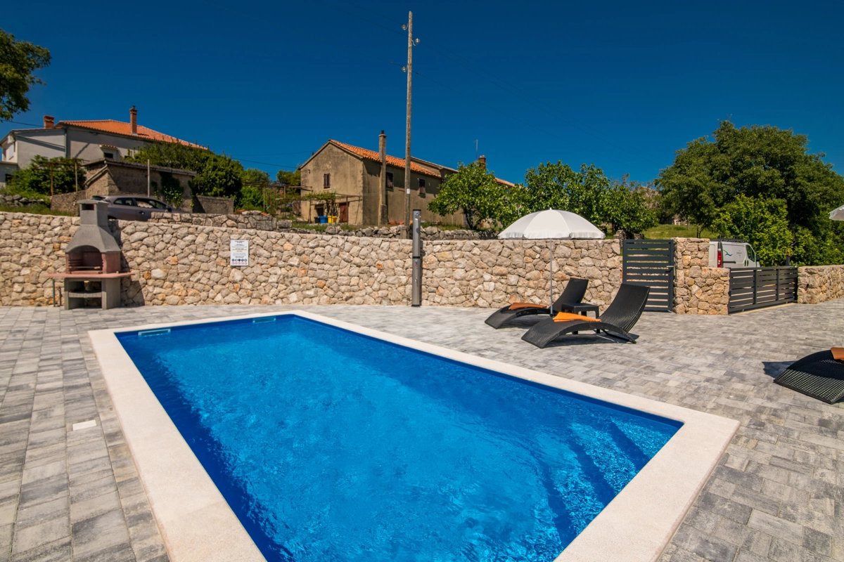 Villa Enie, eine neu erbaute, moderne Villa in Garica bei Vrbnik, verfügt über einen eigenen Pool und bietet Platz für bis zu sechs Personen. Es liegt nur wenige Autominuten von der wunderschönen Stadt Krk entfernt, wo Sie die Altstadt und die wunderschönen Strände besuchen können, sowie von Vrbnik, das für seine lokalen Weine und lokalen Souvenirläden bekannt ist. Die Villa Enie liegt vollständig im Erdgeschoss und bietet einen herrlichen Blick ins Grüne und auf den Wald, den Sie am meisten genießen werden, während Sie in dieser ruhigen Umgebung Ihren Morgenkaffee trinken. Das Haus besteht aus einer geräumigen Küche mit Esszimmer und Wohnzimmer, zwei Doppelzimmern, einem Einzelzimmer und zwei kompletten Badezimmern mit Dusche. Es gibt auch eine überdachte Terrasse mit Blick auf den Pool. Im Innenhof der Villa Enie gibt es einen privaten Swimmingpool und einen Bereich mit Liegestühlen sowie eine Außendusche und einen Grill. Villa Enie ist klimatisiert und verfügt über WLAN und einen privaten Parkplatz für mehrere Autos.