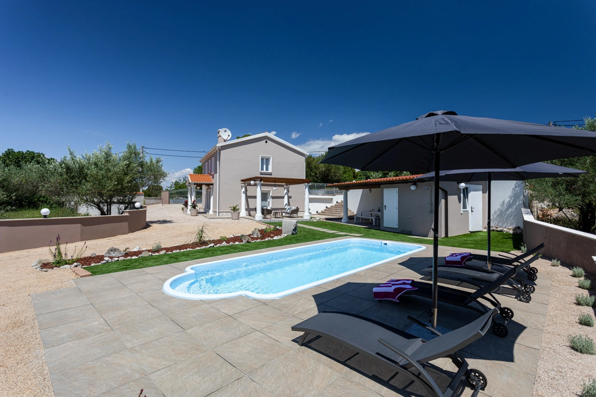 Diese rustikale Villa mit privatem Pool befindet sich in einer stillvollen Gegend auf der Insel Krk und ist für einen ruhigen und entspannenden Urlaub ideal geeignet. Das Anwesen kann bis zu 6 Personen beherbergen. Umgeben von prachtvollen Olivenbäumen scheint die Villa eine richtige Oase zur Entspannung und Erholung zu sein. Die Villa besteht aus zwei Schlafzimern, die jeweils mit Ehebetten, Klimaanlage und TV ausgestattet sind, ein Zimmer hat zudem ein Zusstellbett. Im dieser Etage sind noch ein Bad und im Erdgeschoss eine komplett rustikal ausgestattete Küche mit Esszimmer und ein geräumiges Wohnzimmer mit ausziehbarer Couch. Die Villa ist auf einem 1000 m² grossen Grundstück untergebracht. Im Aussenbereich sind ein privater Pool mit behaglichen Sonnenliegen, ein bedeckter Essraum, wo Sie auch am Grill zubereitete Gerichte im Freien geniessen können, und eine Terrasse zur Verfügung. Villa verfügt uber einen Parkplatz vor dem Haus. Ihr Urlaub kann beginnen.