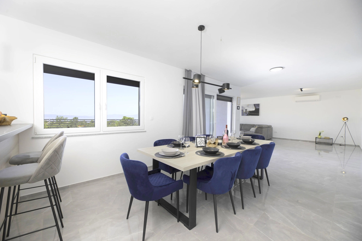 This modern villa with a beautiful panoramic sea view is located in Šmrika, little vilage near island of Krk and can accommodate up to 8 people. A beautiful, large pool in the center of the outer part of the villa, surrounded by sun loungers, in this part there is also a dining room where you can eat delicious meals prepared on the grill. The interior of the villa consists of two floors, the ground floor contains a spacious living room and kitchen with dining area, upstairs there are 3 bedrooms (two of then have balcony with sea view) and 4 fully equipped bathrooms. The whole house is surrounded by greenery that your pet will be able to enjoy. You are also provided with private parking, summer vacation can begin!