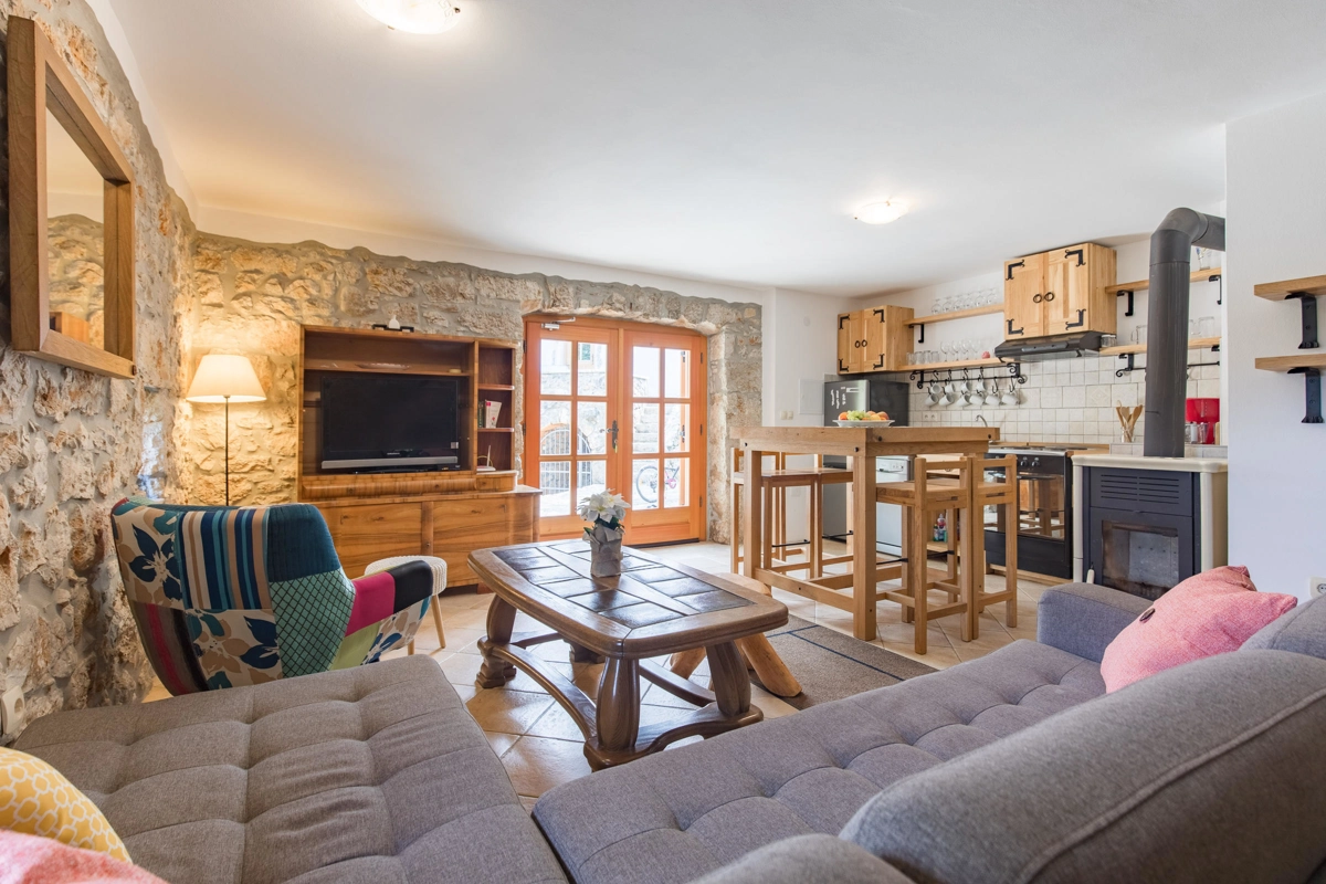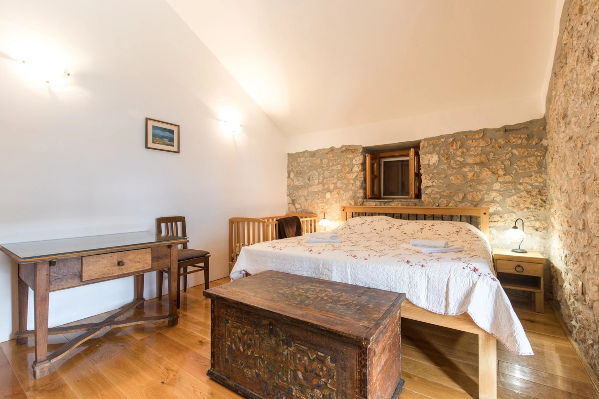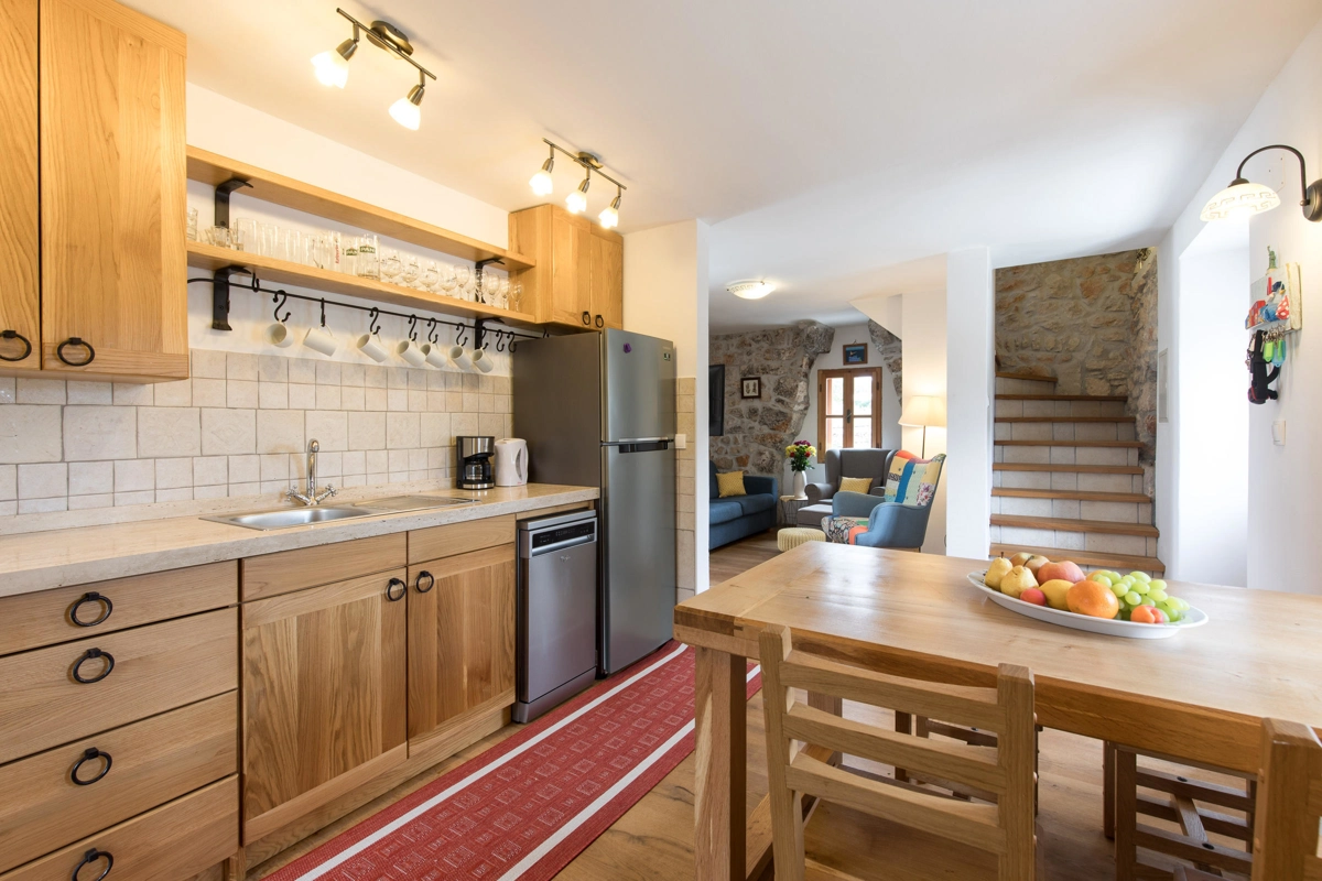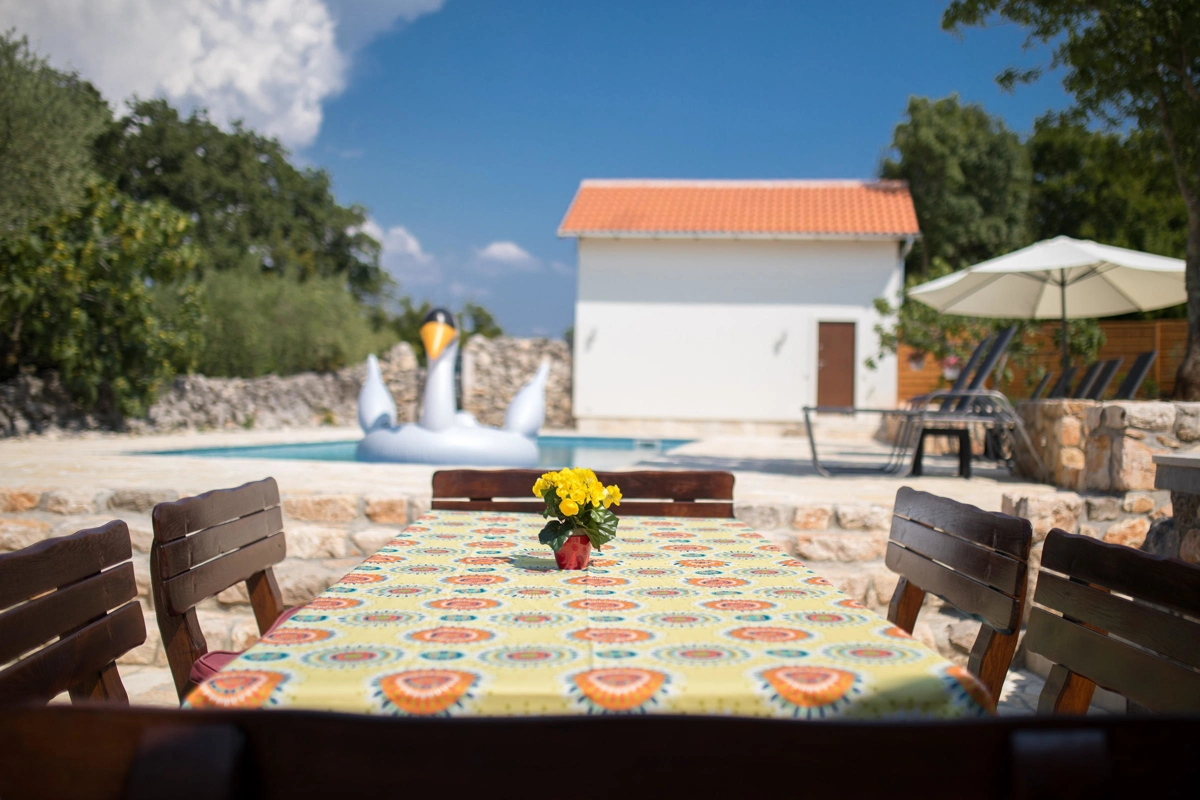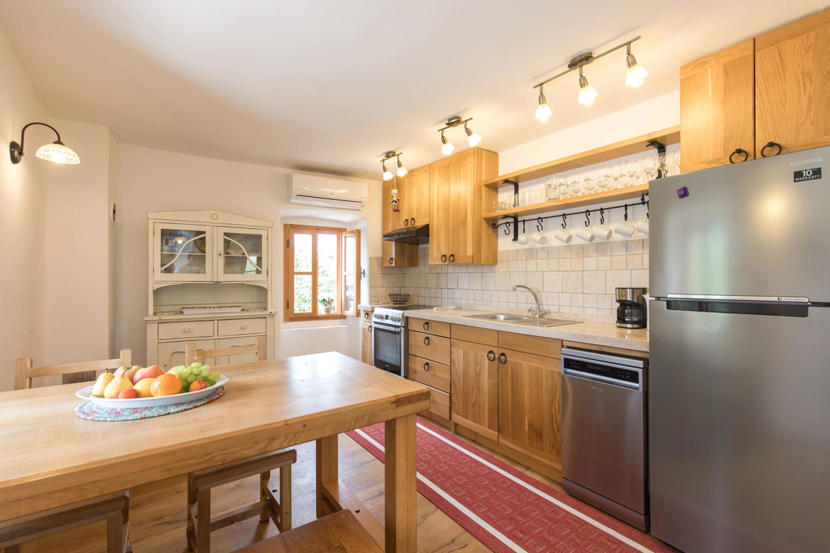Das grossflächige Anwesen ist in zwei neu eingerichteten Steinvillen mit Poo aufgeteilt, die sich in einer ruhigen Gegend auf der Insel Krk befinden und scheinen für einen entspannenden und erholsamen Urlaub wie geschaffen zu sein. Die Villa bietet Platz für bis zu 14 Personen. Unseren Gästen steht ein grosser Parkplatz für mehrere Autos zur Verfügung. Auf der Rückseite des grösseren Hauses ist ein Pool. Für freundliches und angenehmes Beisamensein stehen den Gästen noch eine Küche, ein Getränkekühlschrank, eine Eiswürfelmaschine und ein grosser TV zur Verfügung. Der Wohnberaum wird im Inneren der beiden Häuser erstklassig organisiert, eins davon ist ein Steinhaus, das sich auf zwei Etagen erstreckt. Im Erdgeschoss sind eine Küche, ein Wohnzimmer und ein Esszimmer und in der oberen Etage ein grosses Schlafzimmer mit Galerie und Bad. Das weitere und zugleich grössere Haus besteht aus zwei aufgeteilten Räumen, ein davon bestehend aus Küche, Essraum und Wohnraum mit zwei abgetrennten Betten, Bad und Schlafzimmer liegt im Erdgeschoss. Dieser Hausteil hat direkten Ausgang zum Pool. Auf der ersten und zweiten Etage befindet sich ein behaglicher Wohnraum jeweils mit Wohnzimmer, Küche, Esszimmer, Toilette und Schlafzimmer mit zwei abgetrennten Betten auf der ersten Etage und mit zwei weiteren Schlafzimmern mit Bad im zweiten Stock. Die rückliegende Terrasse hat Zutritt zum Pool mit kühlendem Schatten der mediterranen Bäume, Aussenduschen und Grillraum. Das erstklassig ausgestattete Anwesen ist für Urlaub mehrerer Familien ideal geeignet, die den Wunsch haben, ihre Urlaubstage sowohl in freundlicher Gesellschaft wie auch in einer intimen Privatsphäre zu verbringen.