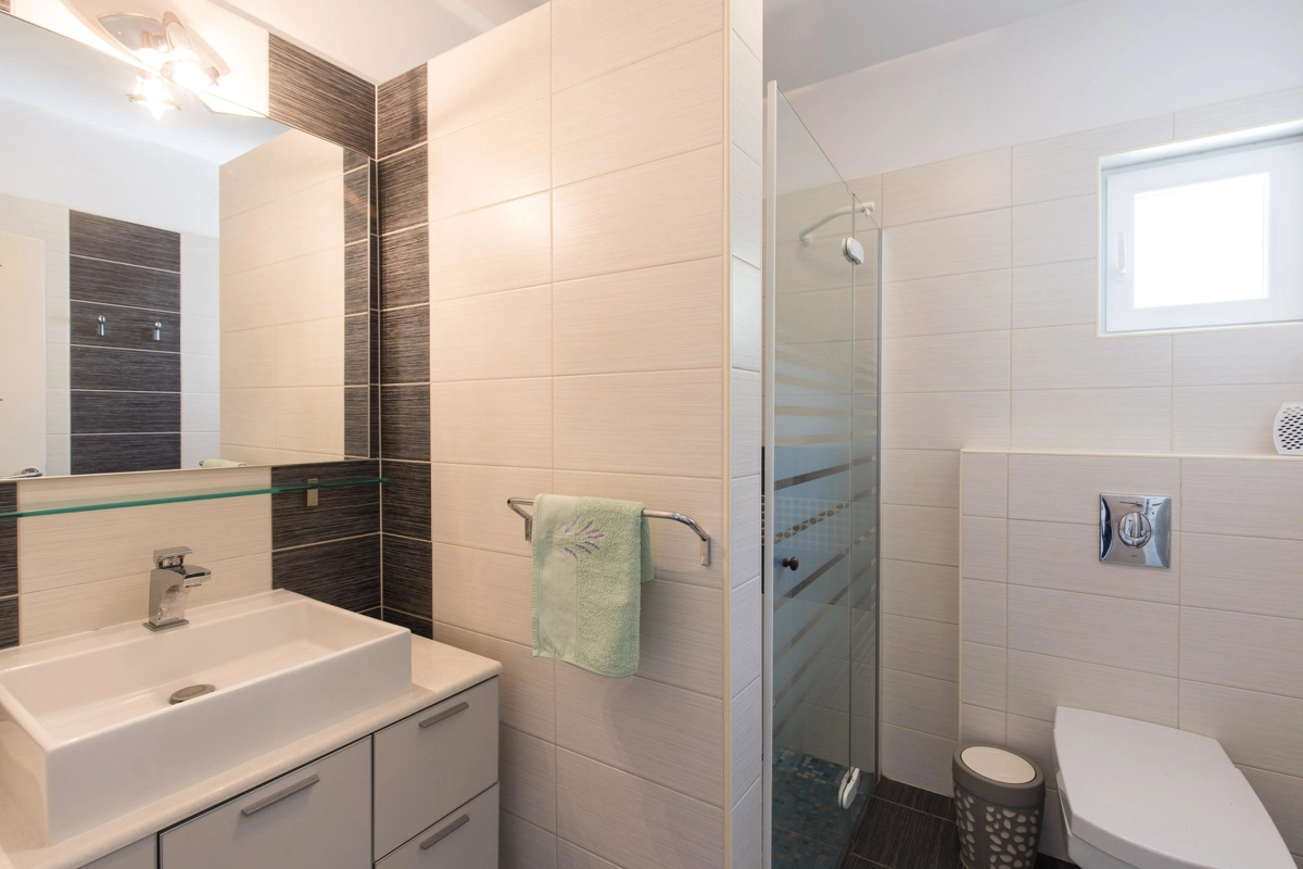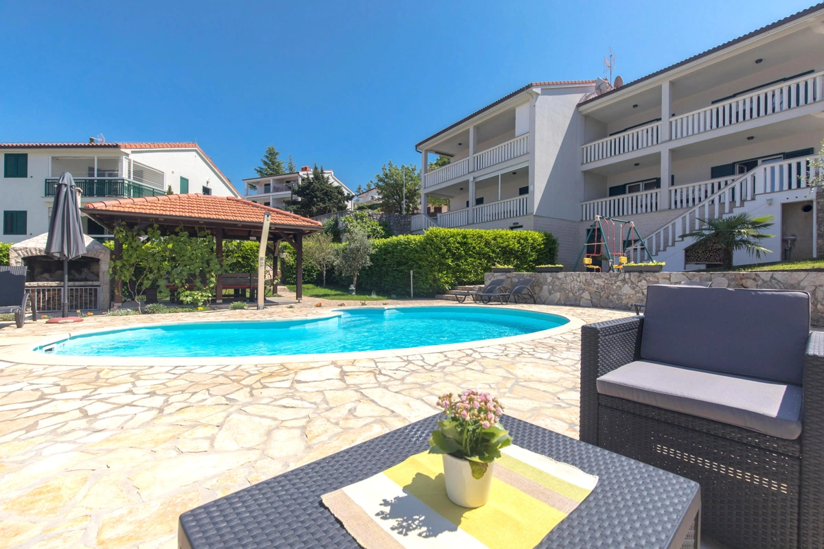 Das herrliche Ferienhaus mit dem Pool ist für den Urlaub von zwei Familien geeignet. Die Villa bietet in 4 Schlafzimmern Platz für 8 – 10 Personen. Es besteht aus zwei identischen Apartements, die einen Hof, eine schattige Gartenlaube und den fantastischen Pool gemeinsam benutzen. Jede Ferienwohnung kann 4-5 Personen in jeweils zwei Schlafzimmern unterbringen, das Wohnzimmer ist grossflächig und geräumig und man kann eine Couch als Zusatzbett benutzen, der Balkon hat einen atemberaubenden Meerblick, dazu kommen noch 2 Schlafzimmer und Badezimmer. Im jeweiligen Wohnobjekt steht den Gästen noch ein Raum mit Waschmaschine zur Verfügung. Die Villa verfügt über einen privaten Parkplatz. Zum Entspannen und sommerlichen Geniessen steht unseren Gästen ein Grillraum zur Verfügung.