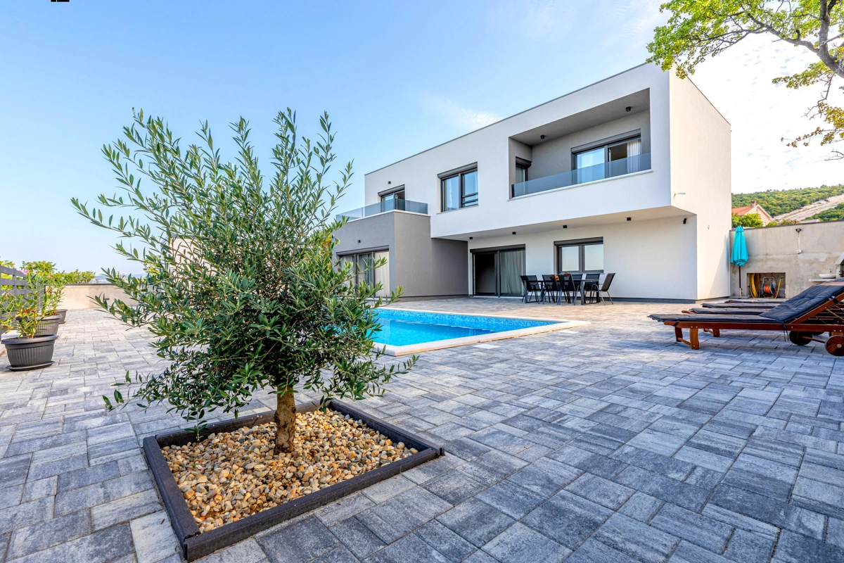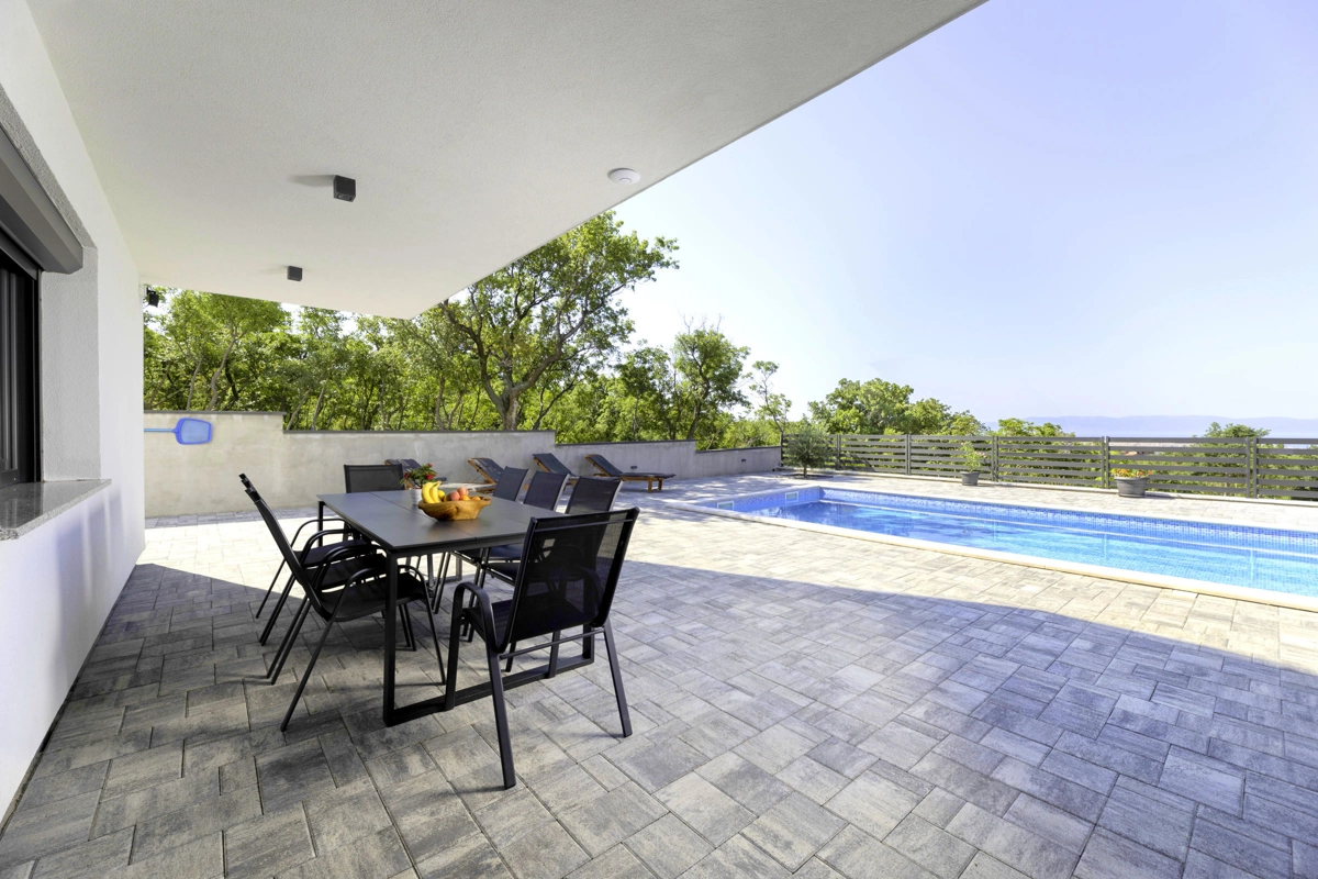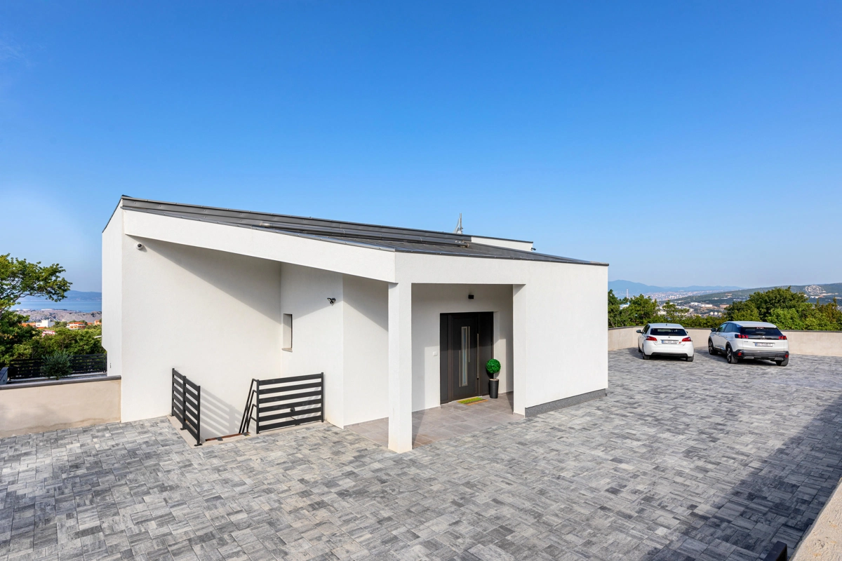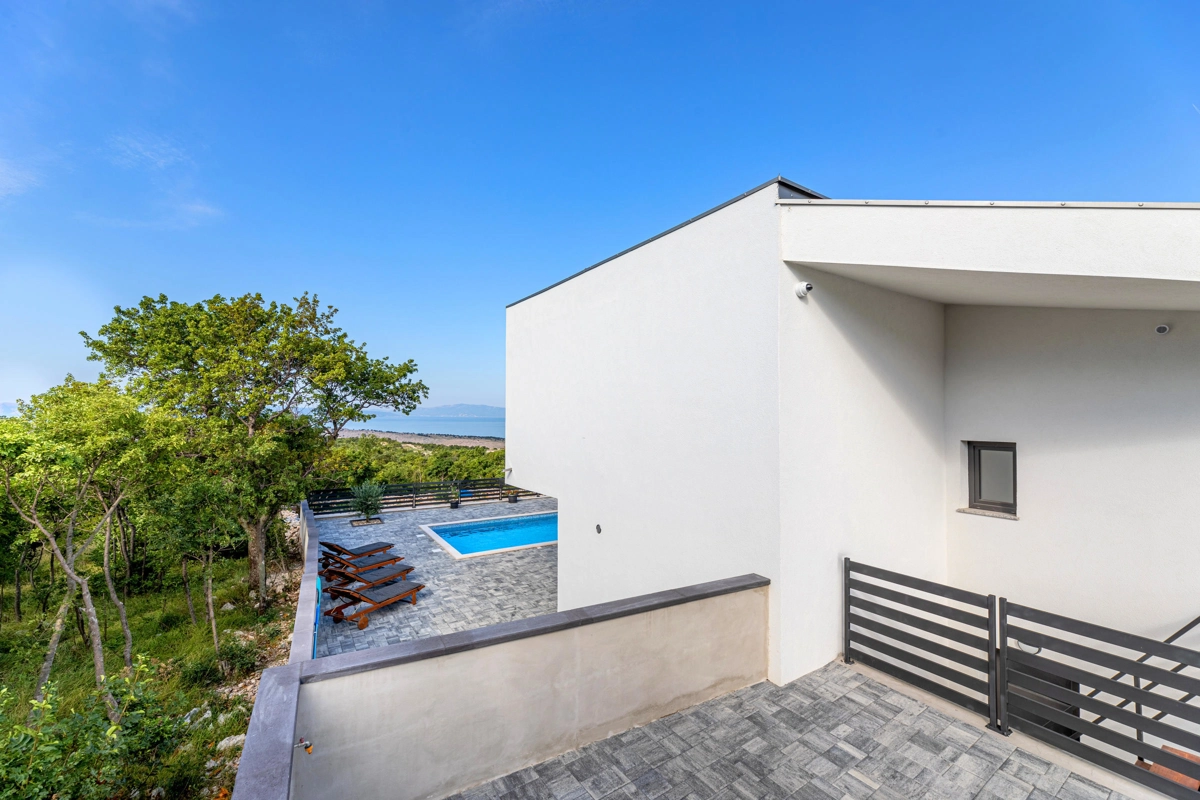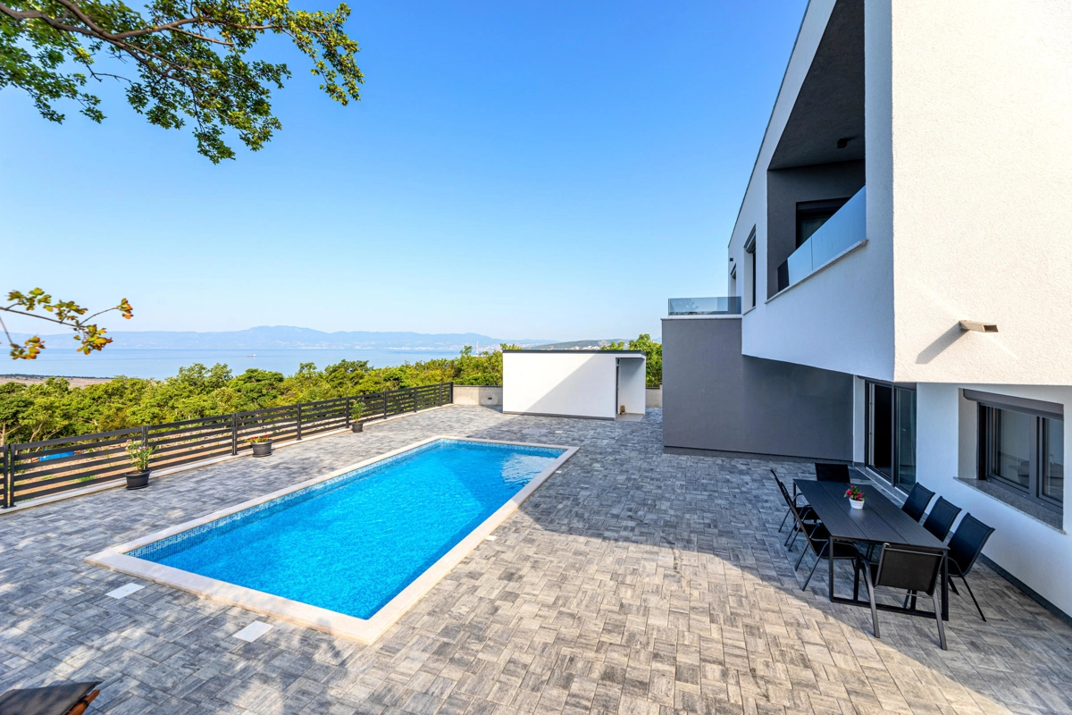 Ova moderna villa s prekrasnim panoramskim pogledom na more nalazi se u mjestu Šmrika nedaleko od otoka Krka te može primiti do 8 osoba. Moderno uređenje je ono što već na prvi pogled godi oku. Lijepi, veliki bazen u središtu je vanjskog dijela ville, a njega okružuju ležaljke za sunčanje, u ovom dijelu također se nalazi i blagovaonica u kojoj možete jesti ukusne obroke pripremljene na roštilju. Interijer ville sastoji se od dvije etaže, prizemni dio sadržava prostrani dnevni boravak te kuhinju s blagovaonicom, na katu se nalaze 3 spavaće sobe od kojih dvije imaju vlastitu terasu s pogledom na more te 4 kompletno opremljene kupaonice. Cijela kuća okružena je zelenilom u kojemu će moći uživati i Vaš kućni ljubimac. Osiguran Vam je i privatni parking te uživanje može početi!