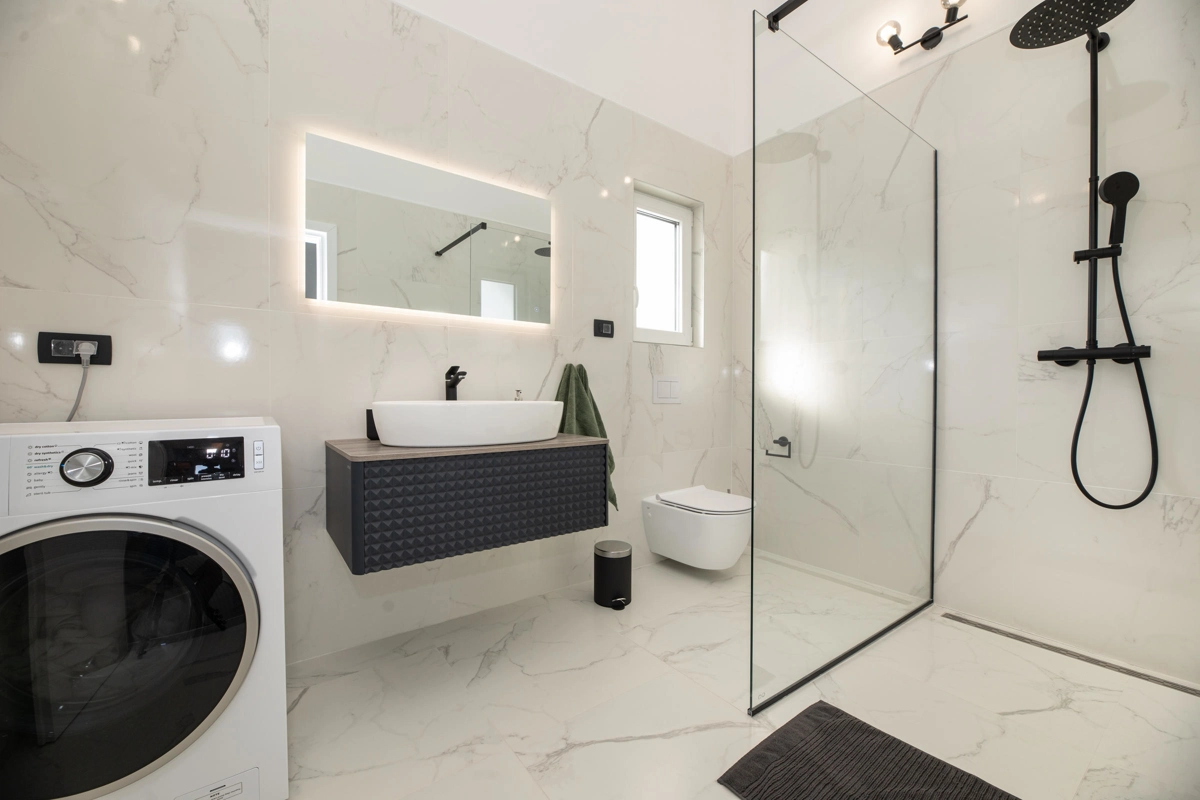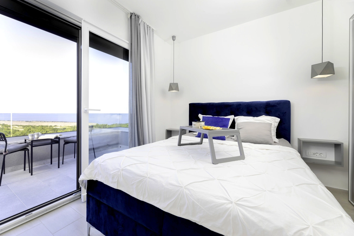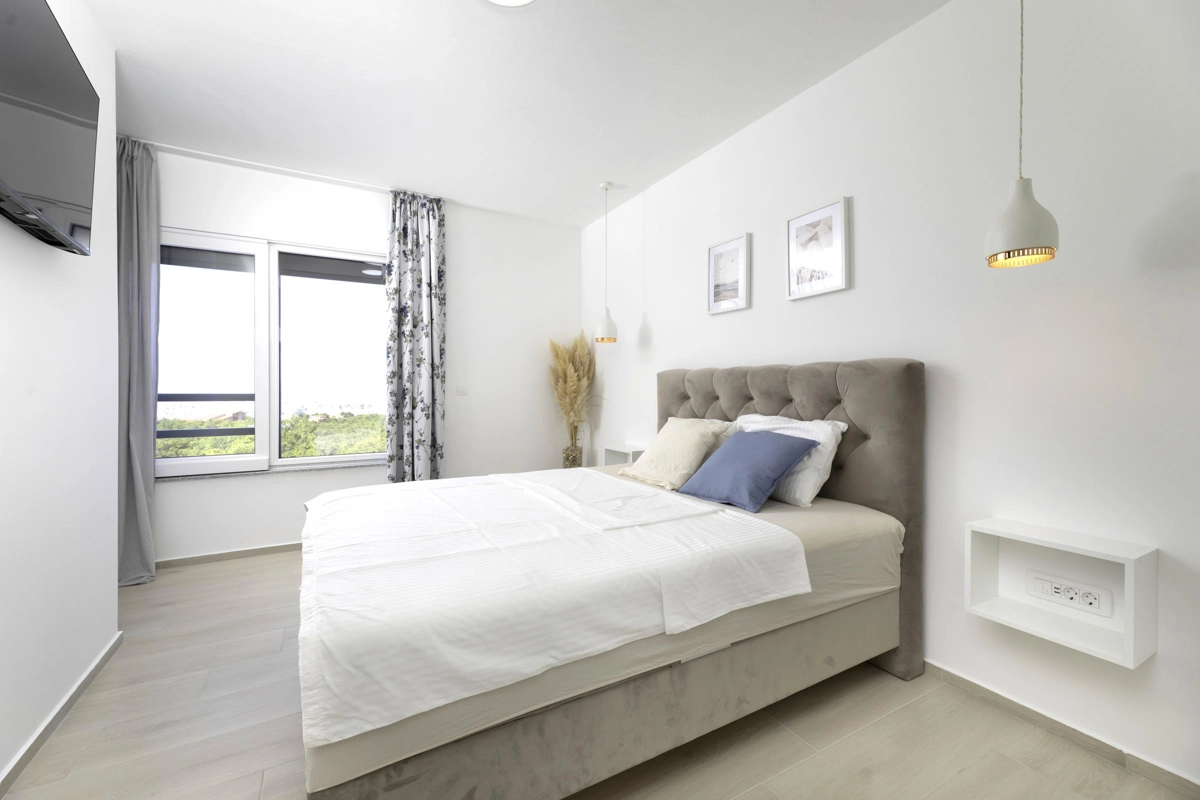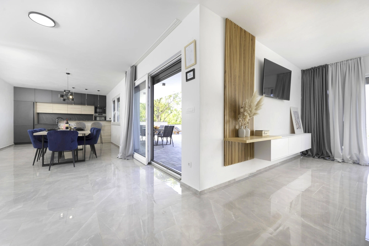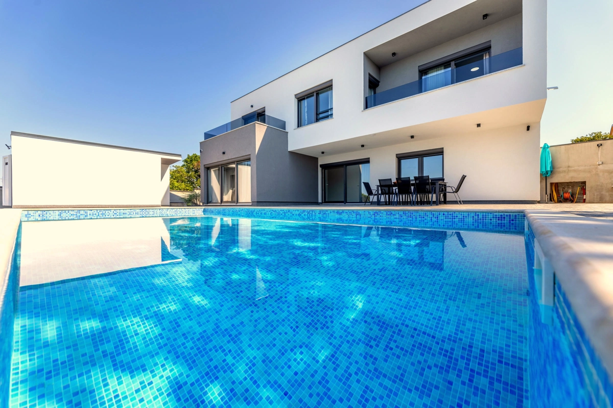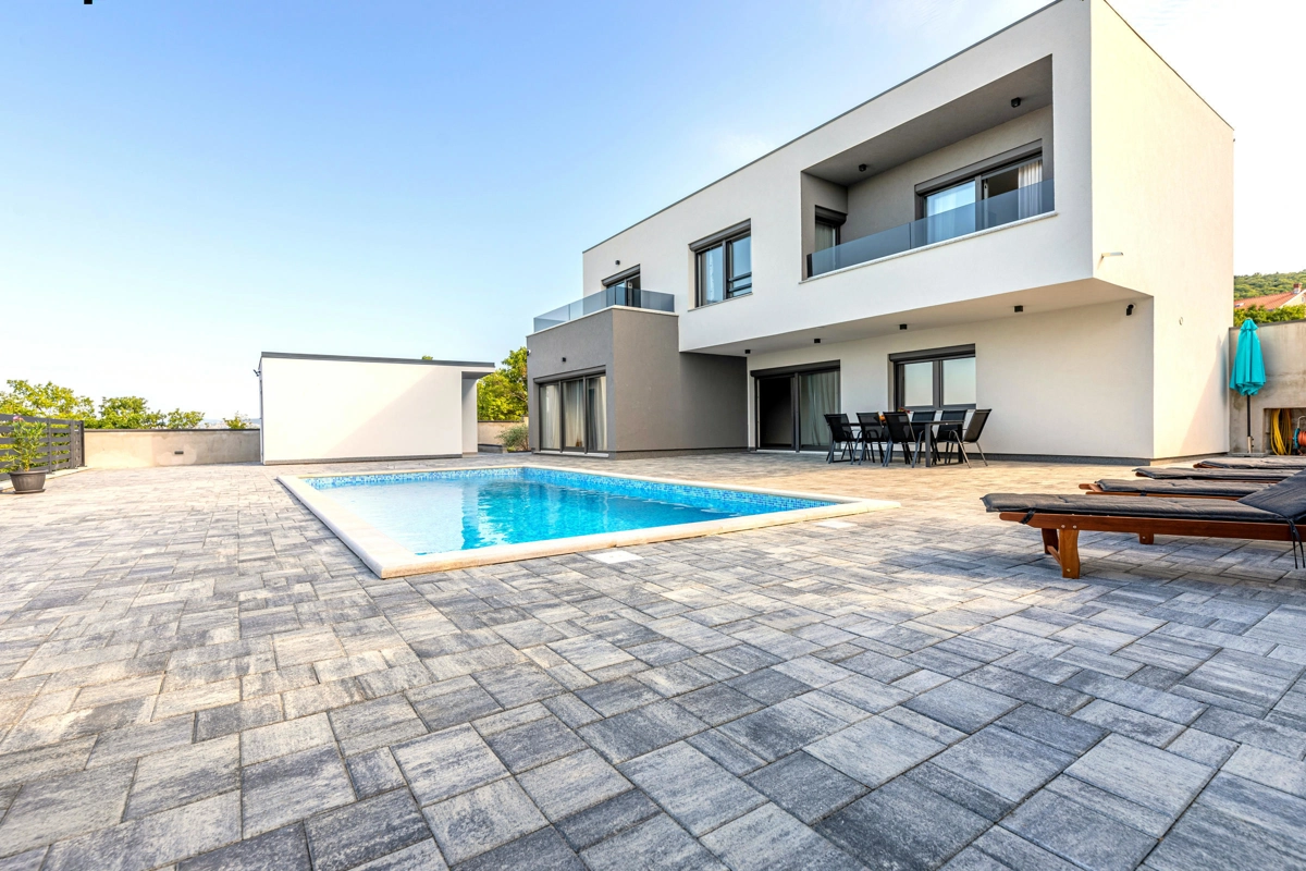 Ova moderna villa s prekrasnim panoramskim pogledom na more nalazi se u mjestu Šmrika nedaleko od otoka Krka te može primiti do 8 osoba. Moderno uređenje je ono što već na prvi pogled godi oku. Lijepi, veliki bazen u središtu je vanjskog dijela ville, a njega okružuju ležaljke za sunčanje, u ovom dijelu također se nalazi i blagovaonica u kojoj možete jesti ukusne obroke pripremljene na roštilju. Interijer ville sastoji se od dvije etaže, prizemni dio sadržava prostrani dnevni boravak te kuhinju s blagovaonicom, na katu se nalaze 3 spavaće sobe od kojih dvije imaju vlastitu terasu s pogledom na more te 4 kompletno opremljene kupaonice. Cijela kuća okružena je zelenilom u kojemu će moći uživati i Vaš kućni ljubimac. Osiguran Vam je i privatni parking te uživanje može početi!