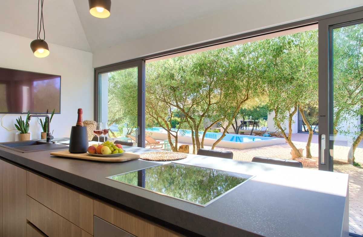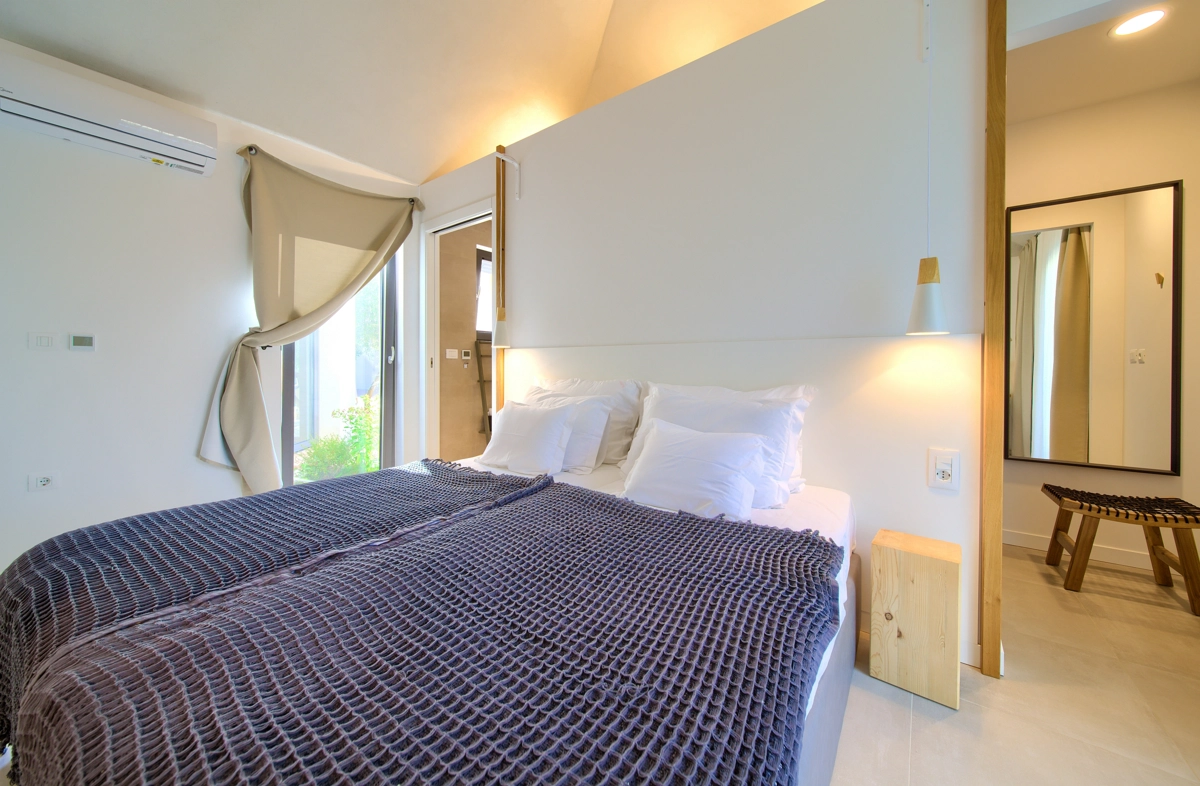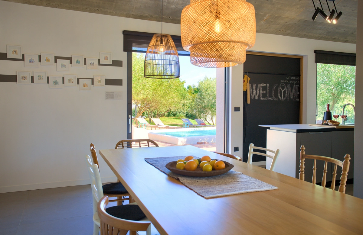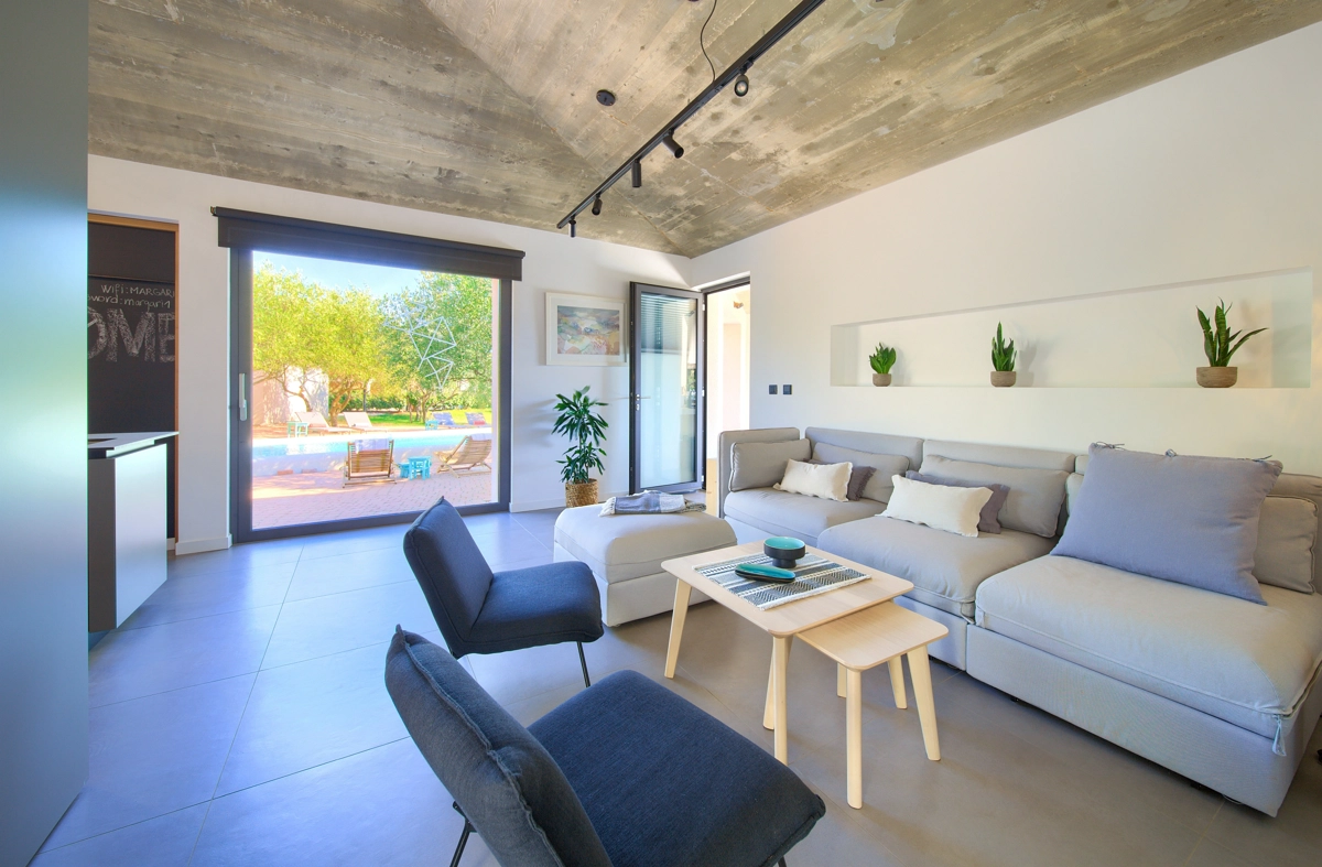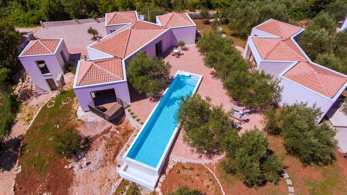 La struttura della casa, interessante e suggestiva, in realtà è divisa in 3 parti, la prima è dotata dʾʾingresso e la reception con parcheggio anteriore e di accesso alla casa più grande con un soggiorno, una cucina moderna completamente attrezzata, una sala da pranzo e 2 camere da letto con bagni privati e una cabina armadio. Le camere da letto hanno entrambe lʾaccesso alla piccolla terrazza e all´ atrio centrale con la fantastica piscina ed una loggia con barbecue e sala da pranzo esteriore. Dal cortile centrale si accede alla casa più piccola, dominata da una strepitosa cucina a isola come una soluzione di grande tendenza e prestigio ideale per preparare pasti gustosi. Anchʾessa dispone di 2 camere da letto con bagni privati, cabina armadio e terrazze private ed è accessibile tramite area pranzo allʾaperto con tanto spazio per trascorerre momenti estivi unici ed indimenticabili in allegra compagnia.