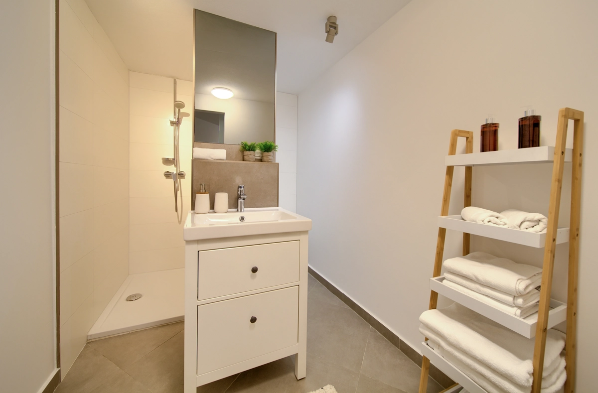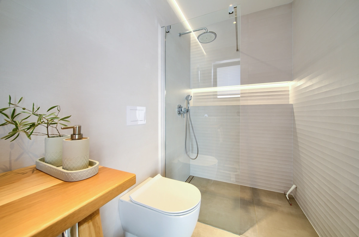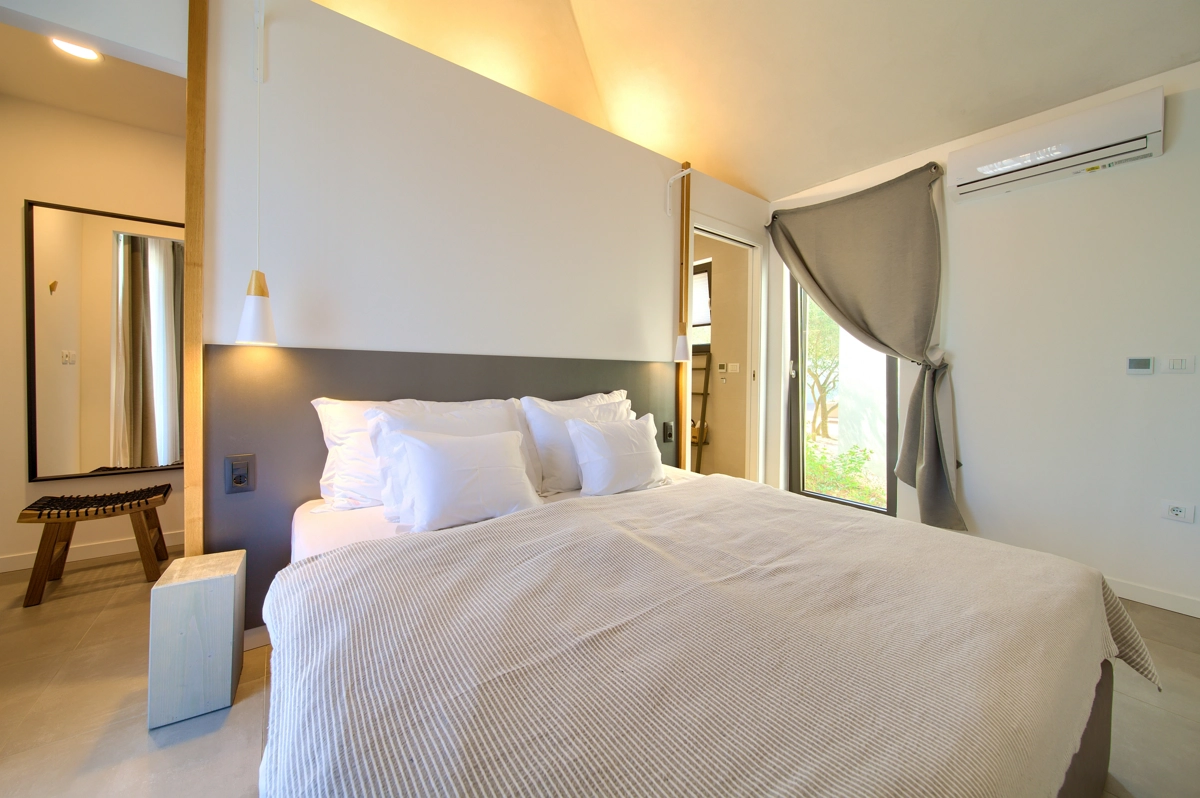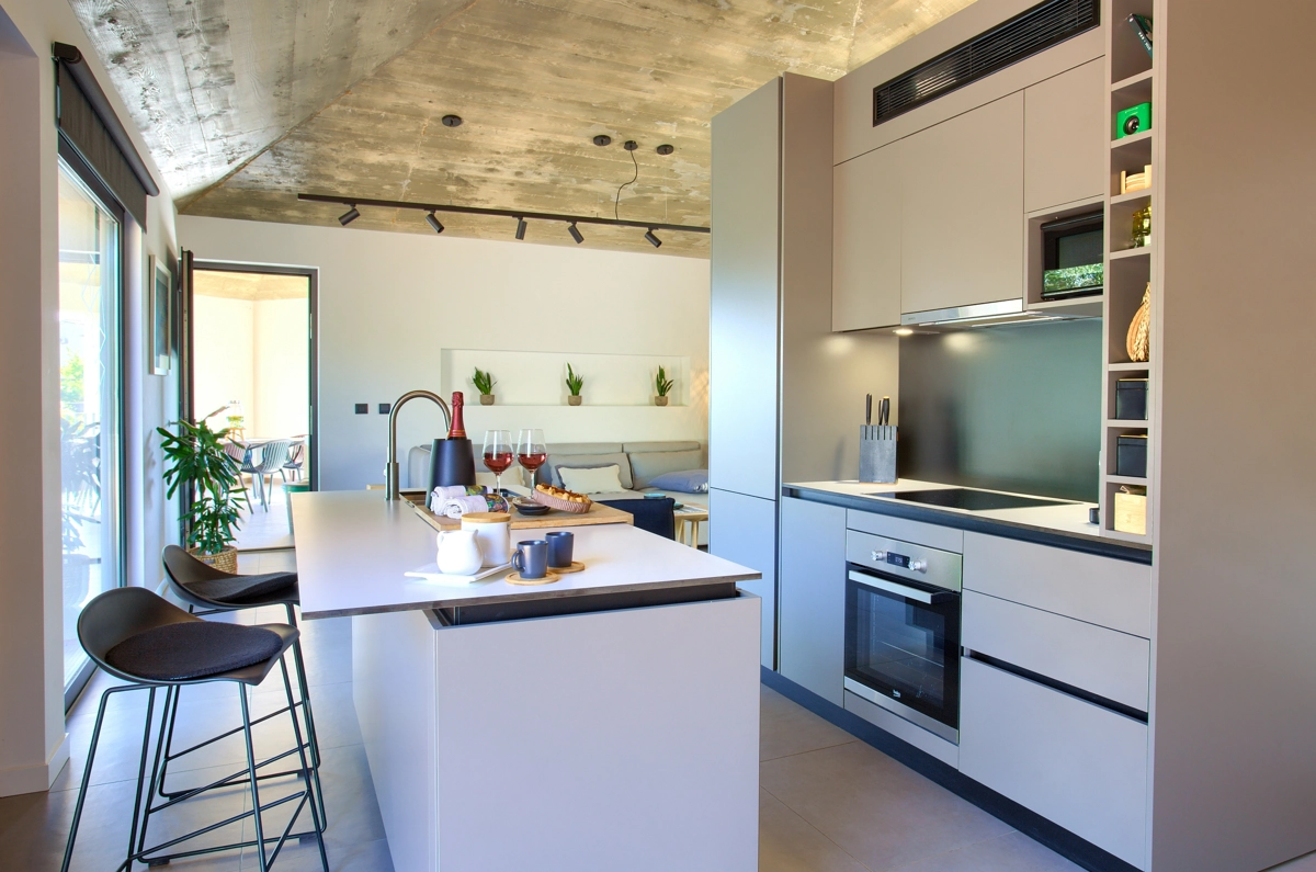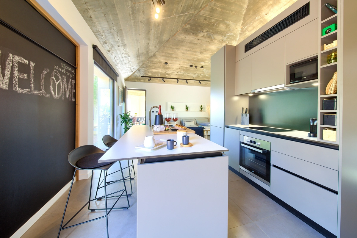 La struttura della casa, interessante e suggestiva, in realtà è divisa in 3 parti, la prima è dotata dʾʾingresso e la reception con parcheggio anteriore e di accesso alla casa più grande con un soggiorno, una cucina moderna completamente attrezzata, una sala da pranzo e 2 camere da letto con bagni privati e una cabina armadio. Le camere da letto hanno entrambe lʾaccesso alla piccolla terrazza e all´ atrio centrale con la fantastica piscina ed una loggia con barbecue e sala da pranzo esteriore. Dal cortile centrale si accede alla casa più piccola, dominata da una strepitosa cucina a isola come una soluzione di grande tendenza e prestigio ideale per preparare pasti gustosi. Anchʾessa dispone di 2 camere da letto con bagni privati, cabina armadio e terrazze private ed è accessibile tramite area pranzo allʾaperto con tanto spazio per trascorerre momenti estivi unici ed indimenticabili in allegra compagnia.