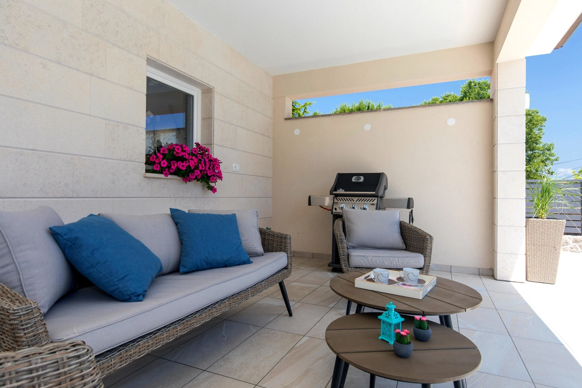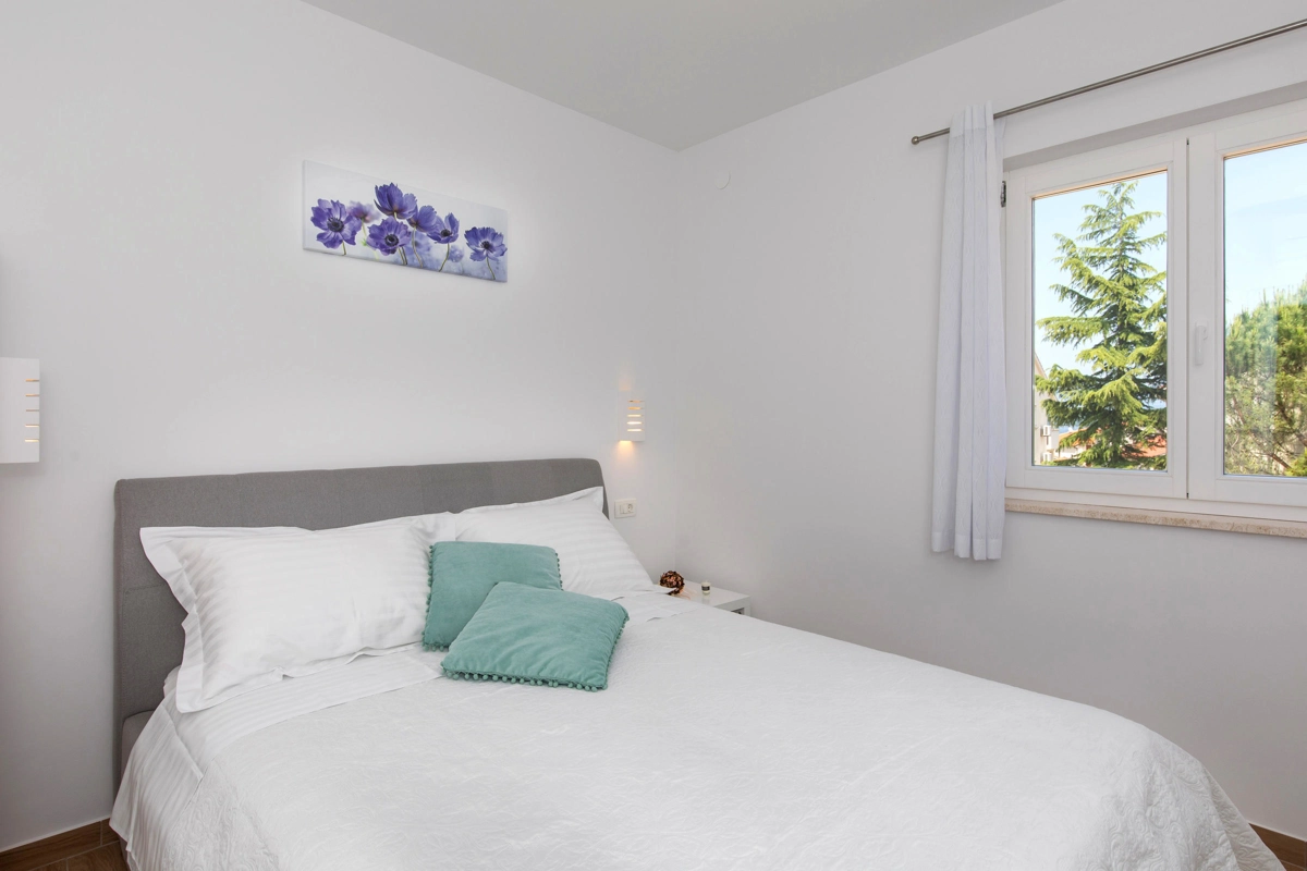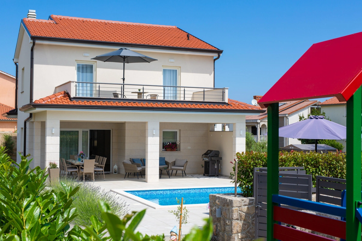 Luxury villa Magdalena is located in the small town of Porat and is an ideal choice for a summer vacation for families with children and can accommodate up to 7 people in 3 bedrooms and two more on extra beds. The interior of this villa is modernly decorated, it is equipped with 3 bathrooms and one toilet, the villa has a spacious living room with kitchen and dining area, this villa has two terraces overlooking the greenery. The real Mediterranean atmosphere is complemented by a swimming pool, sun deck and barbecue for several people. There are several parking spaces available for a carefree holiday with children who also have their own playground. The beach is only 350 m from the house and guests can enjoy on the beautiful beach.