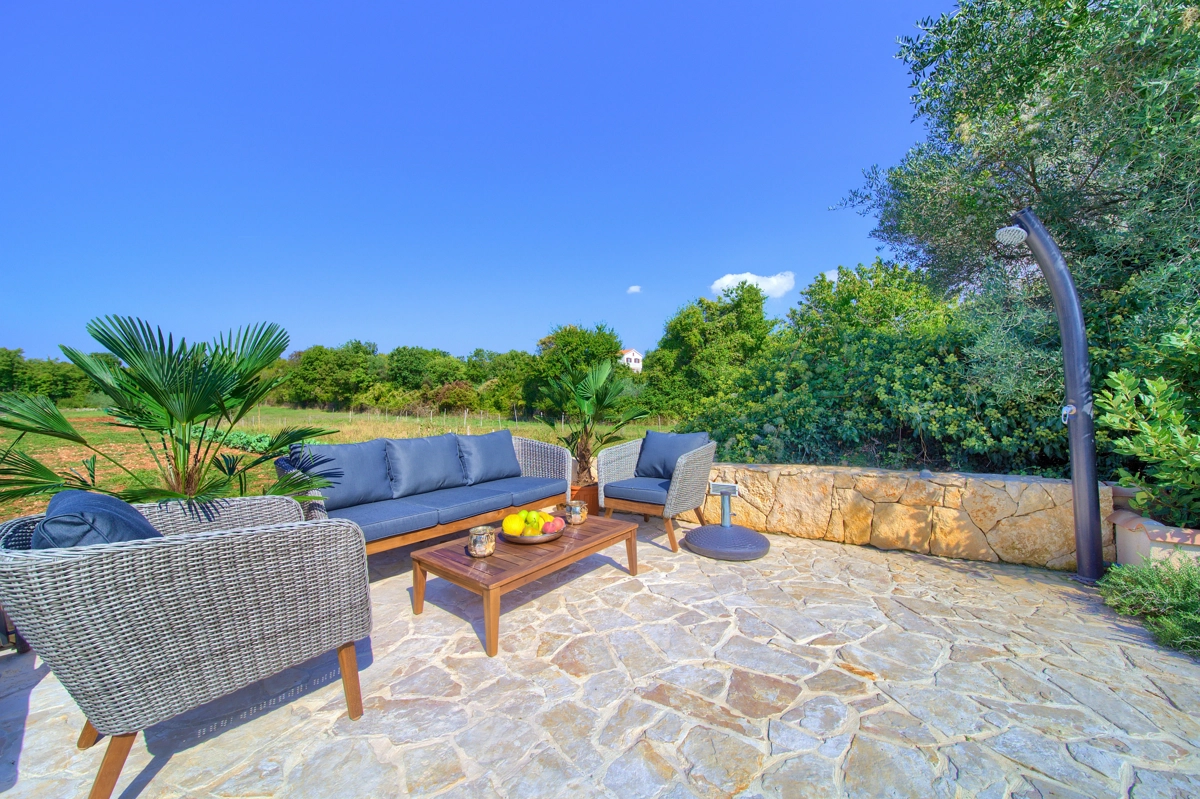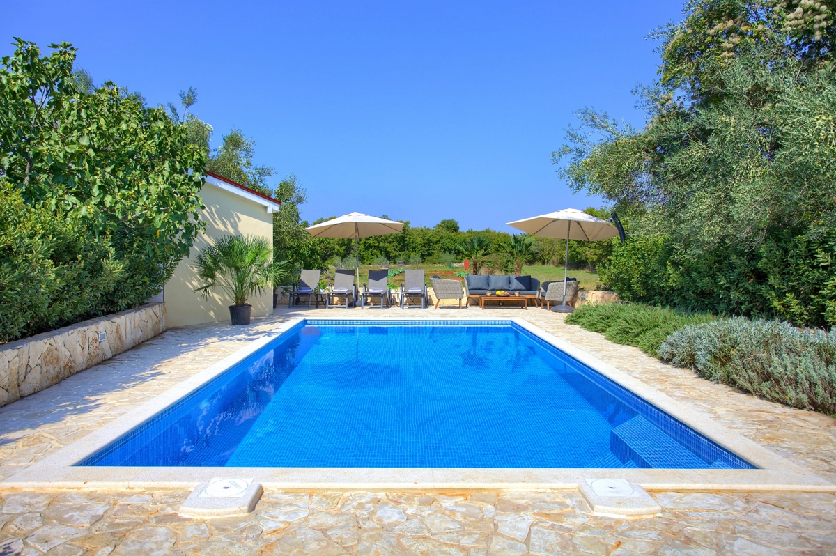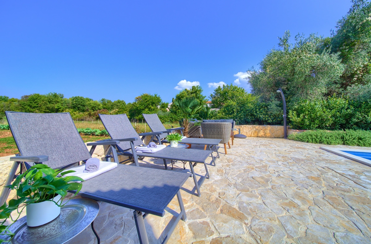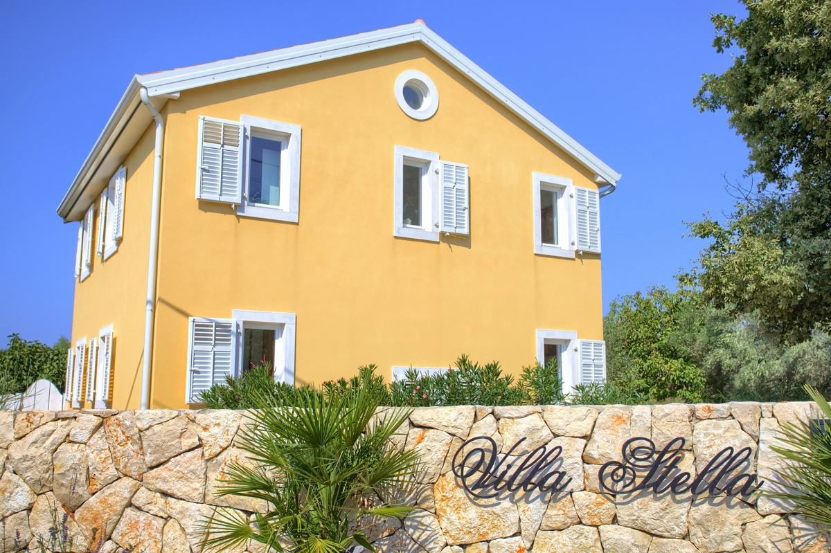 This charming villa full of greenery is modernly equipped and located in the small village Oštrobradići near Malinska. Accommodation for up to 6 people who will be accommodated in 3 comfortable bedrooms located on the upper floor, same floor also has a bathroom. On the ground floor of this family house there is a living room full of light, a kitchen and dining room with fireplace and a bathroom with shower. From the living room you can directly access the outdoor pool with sun loungers and sunbathing area, which is ideal for getting a tan. The outdoor dining area is a great choice for al fresco dining overlooking the pool and greenery. Private parking is provided for 2 cars. Villa Stella is ideal for a family vacation in the summer months, we look forward to your arrival!